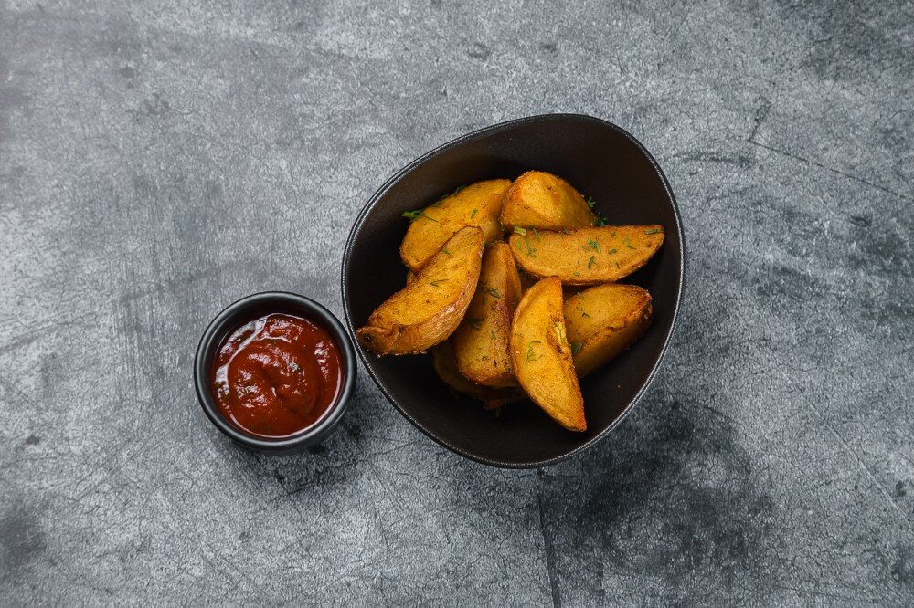 это ароматные дольки картофеля, запечённые до хрустящей корочки снаружи и мягкой сердцевины внутри.