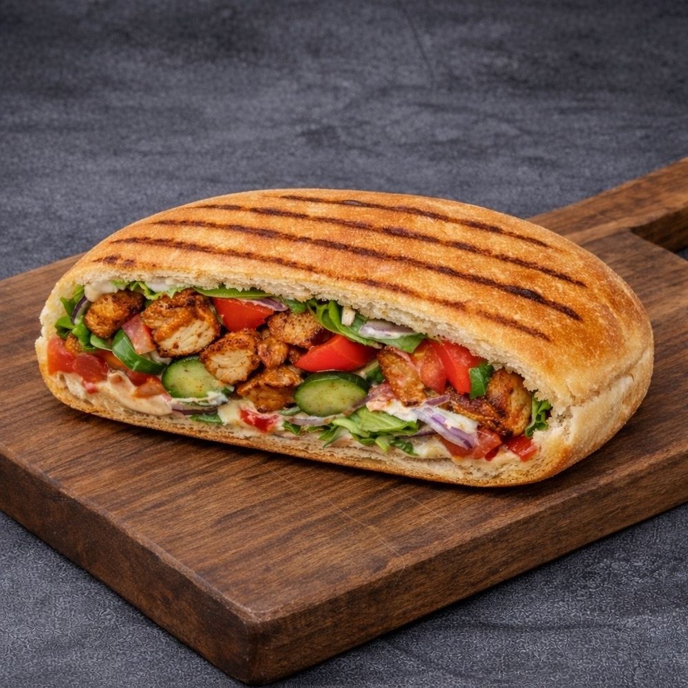 Нежное куриное мясо, обжаренное на углях, сочные томаты, хрустящие огурцы и капуста, пикантная морковь по-корейски. Нежный сыр Всё это — в хрустящей булочке.